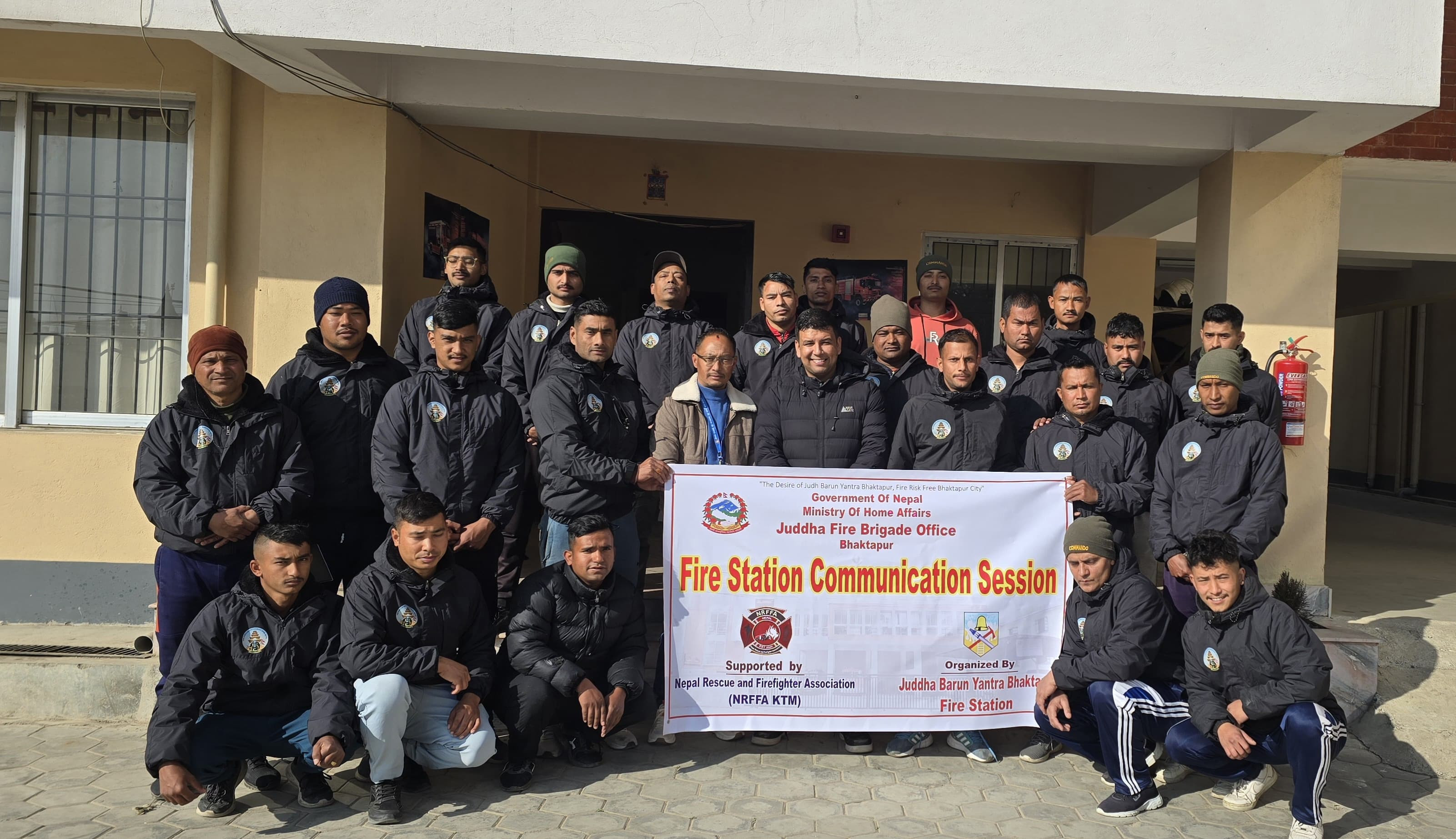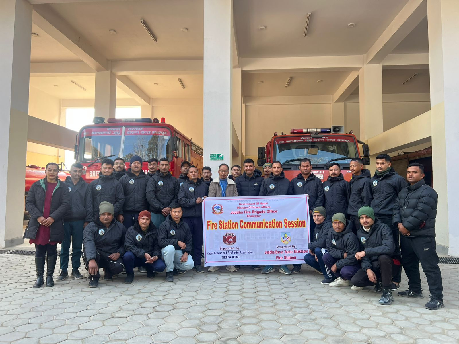 आज मिति २०८१/१०/०८ गतेका दिन जुद्ध बारुण यन्त्र कार्यालय भक्तपुरको आयोजना तथा नेपाल रेस्क्यु एण्ड फायरफाइटर एशोसिएसन (NRFFA KTM) को प्राविधिक सहयोगमा प्रशिक्षकद्वय श्री मधुसुदन थापा र श्री सोनी फाजुज्यू बाट फायर स्टेशन कम्युनिकेशन सेशन (Fire Station Communication Session) कार्यक्रम सम्पन्न गरिएको छ।