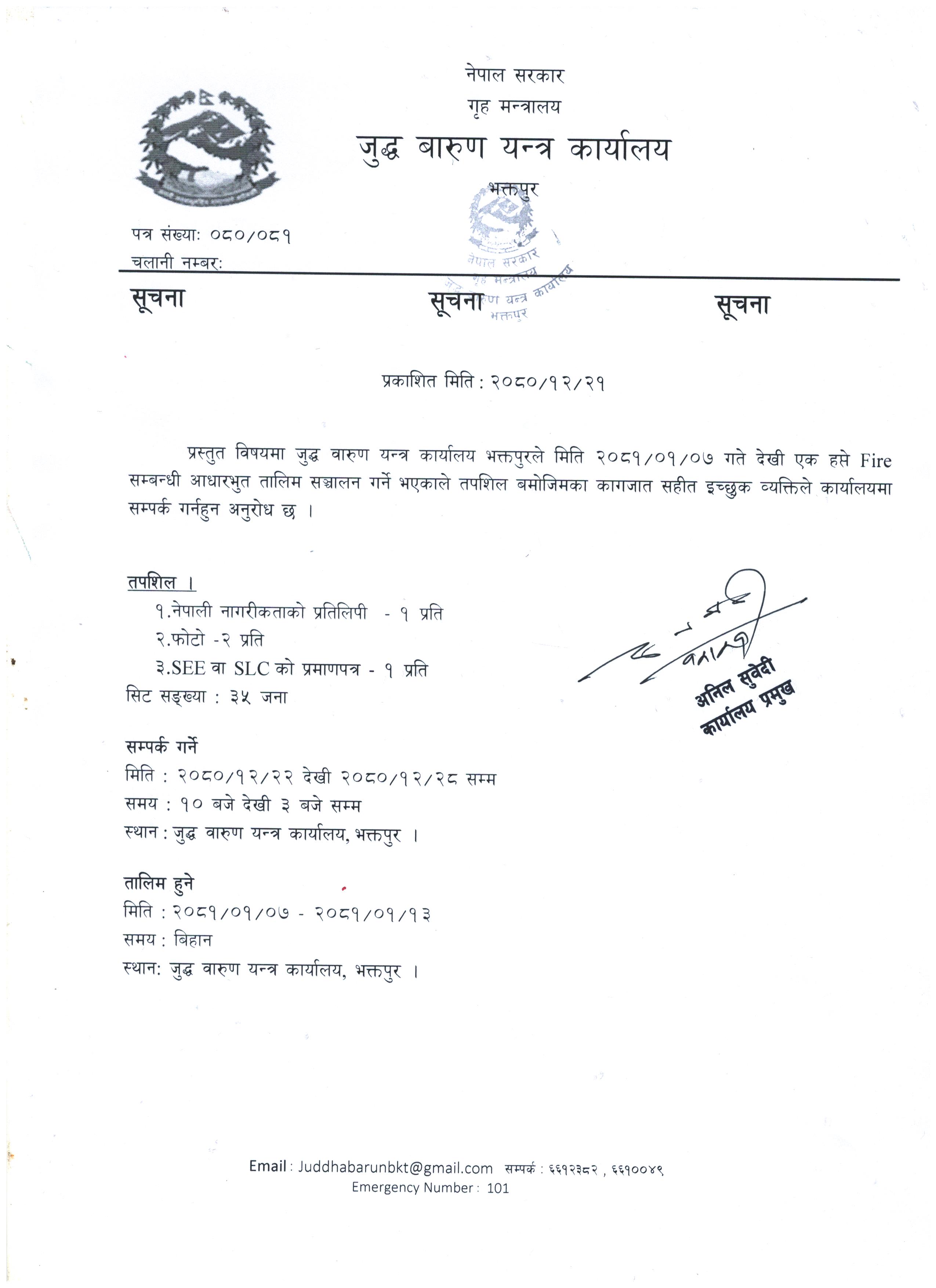आगलागी सम्बन्धी आधारभुत तालिम सञ्चालन सम्बन्धी सुचना