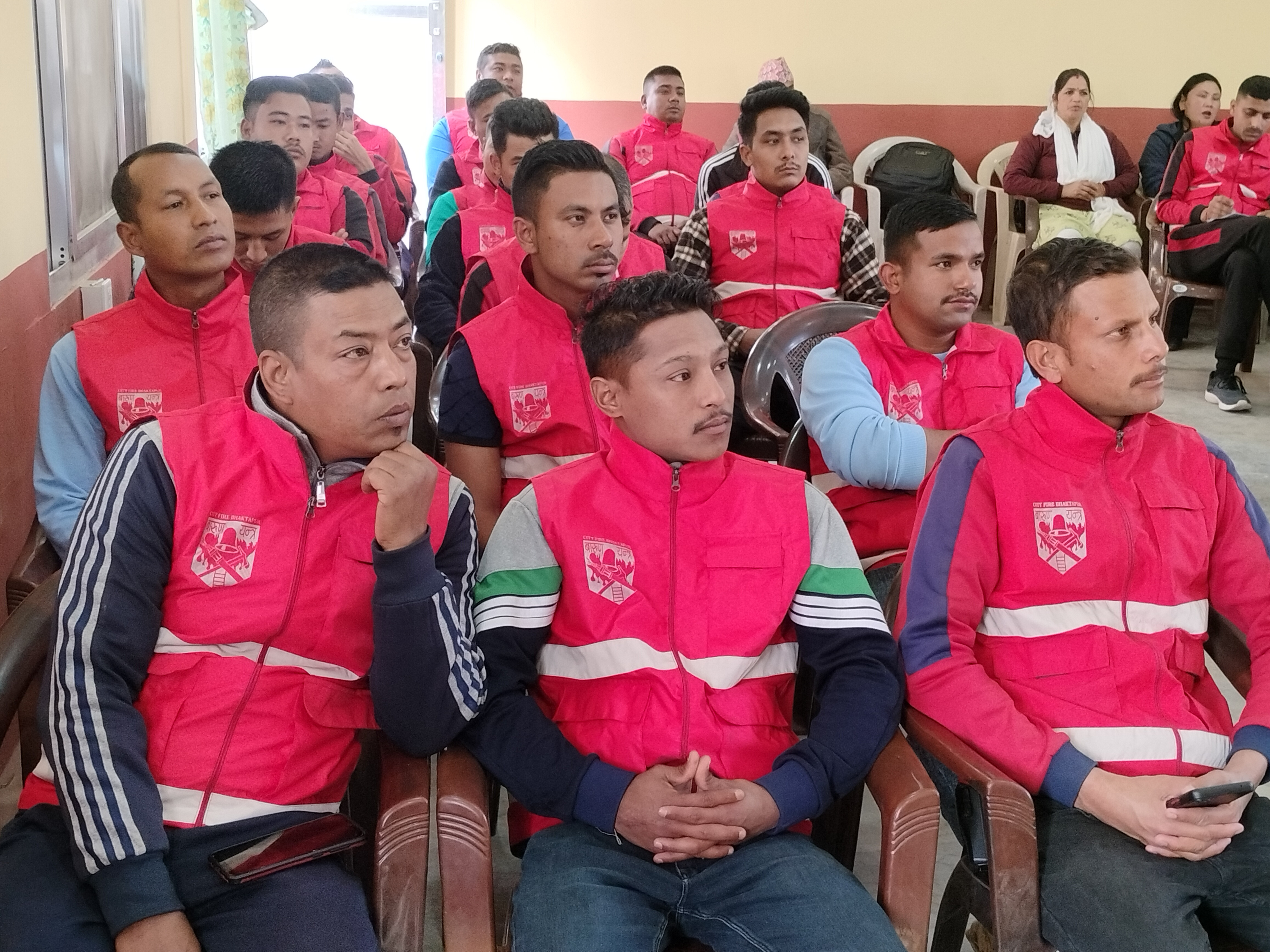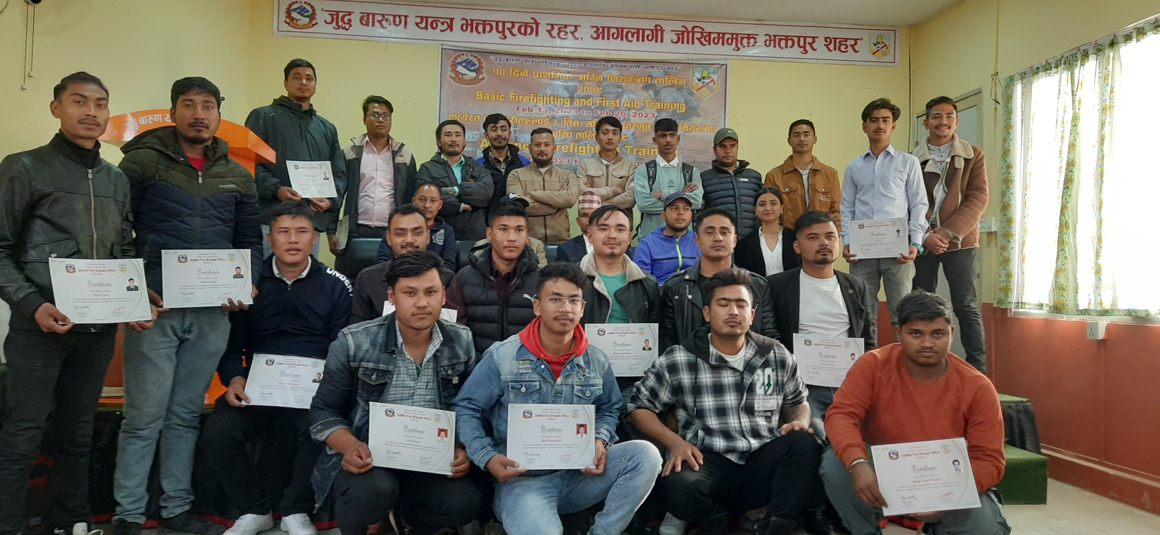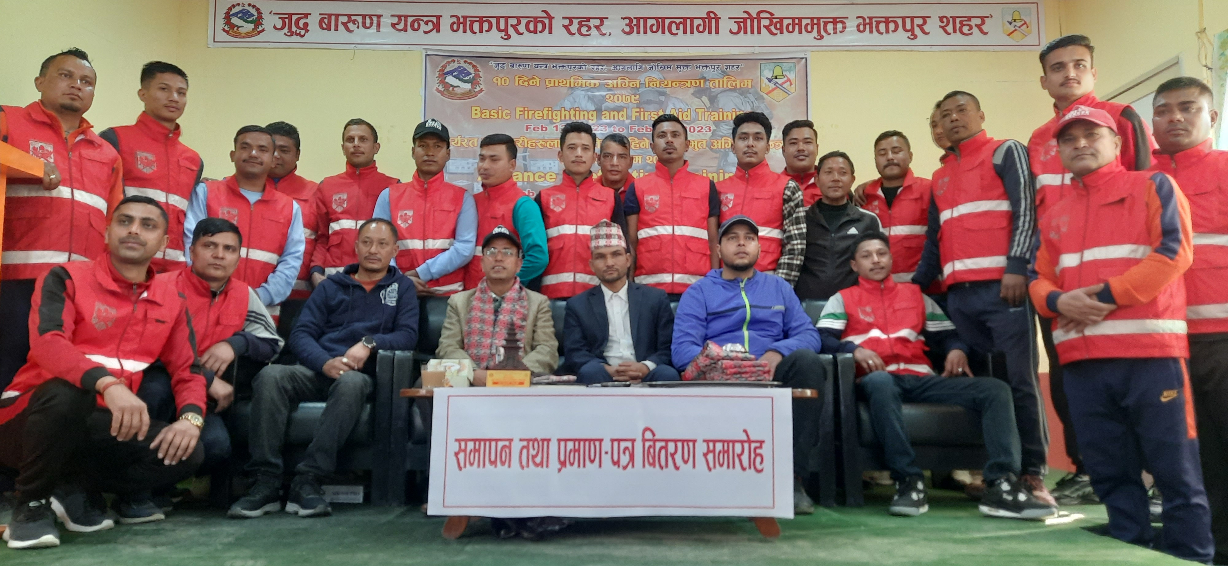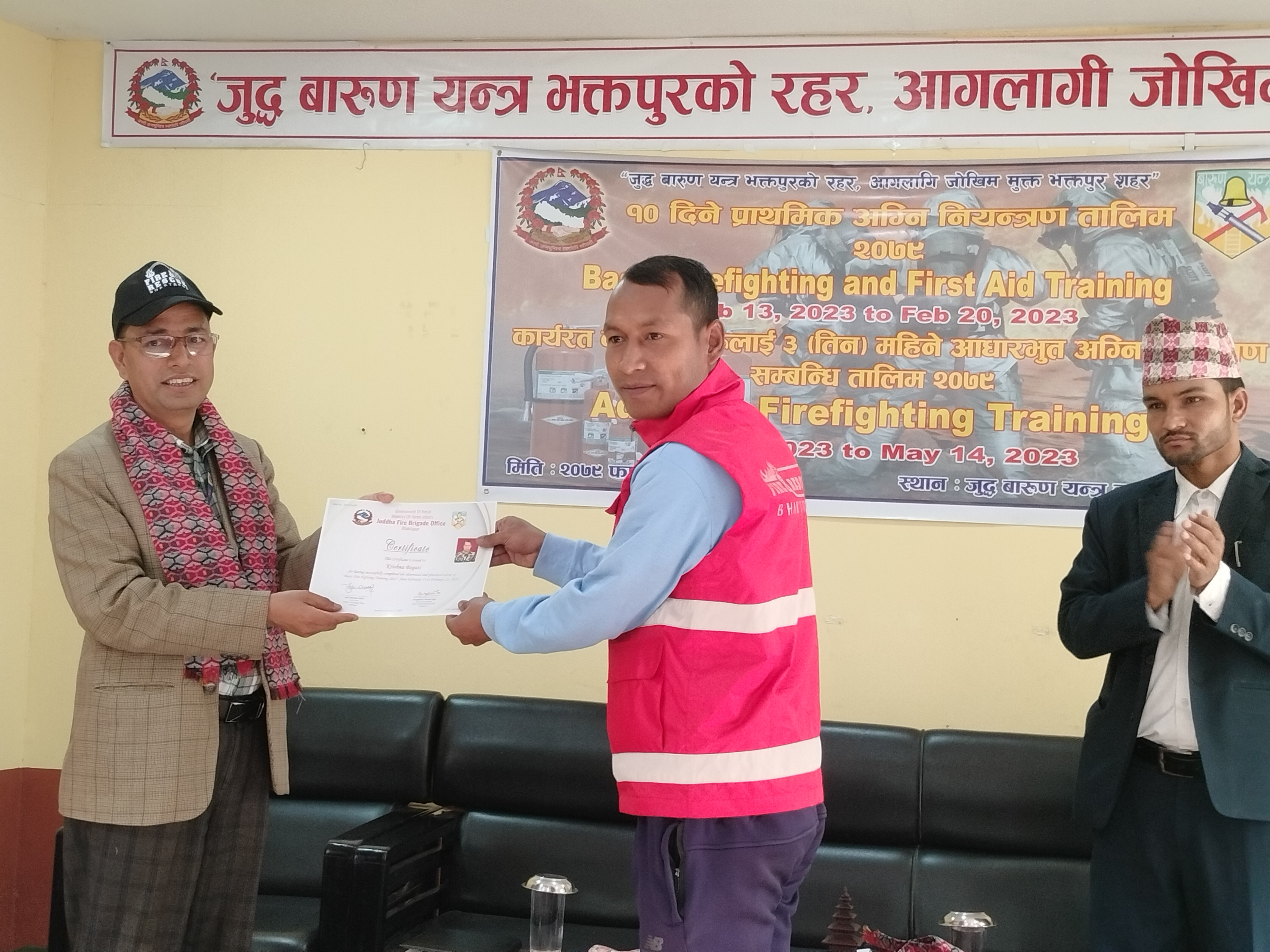 कार्यालय प्रमुख श्री लाेक बहादुर कार्कि काे सभापतित्व तथा प्रमुख जिल्ला अधिकारी श्री खगेन्द्र प्रसाद रिजाल ज्यू काे प्रमुख आतिथ्यतामा यहि मिति २०७९ / ११ / ०१ गतेबाट २०७९ / ११ / १० गतेसम्म यस जुद्द बारुण यन्त्र कार्यालय भक्तपुरले आयाेजना गरेकाे " १० दिने प्राथमिक अग्नि नियन्त्रण सम्बन्धि तालिम २०७९ " काे समापन कार्यक्रम सफलता पुर्वक सम्पन्न गरियाे । मिति २०७९/११/१२ गते ।