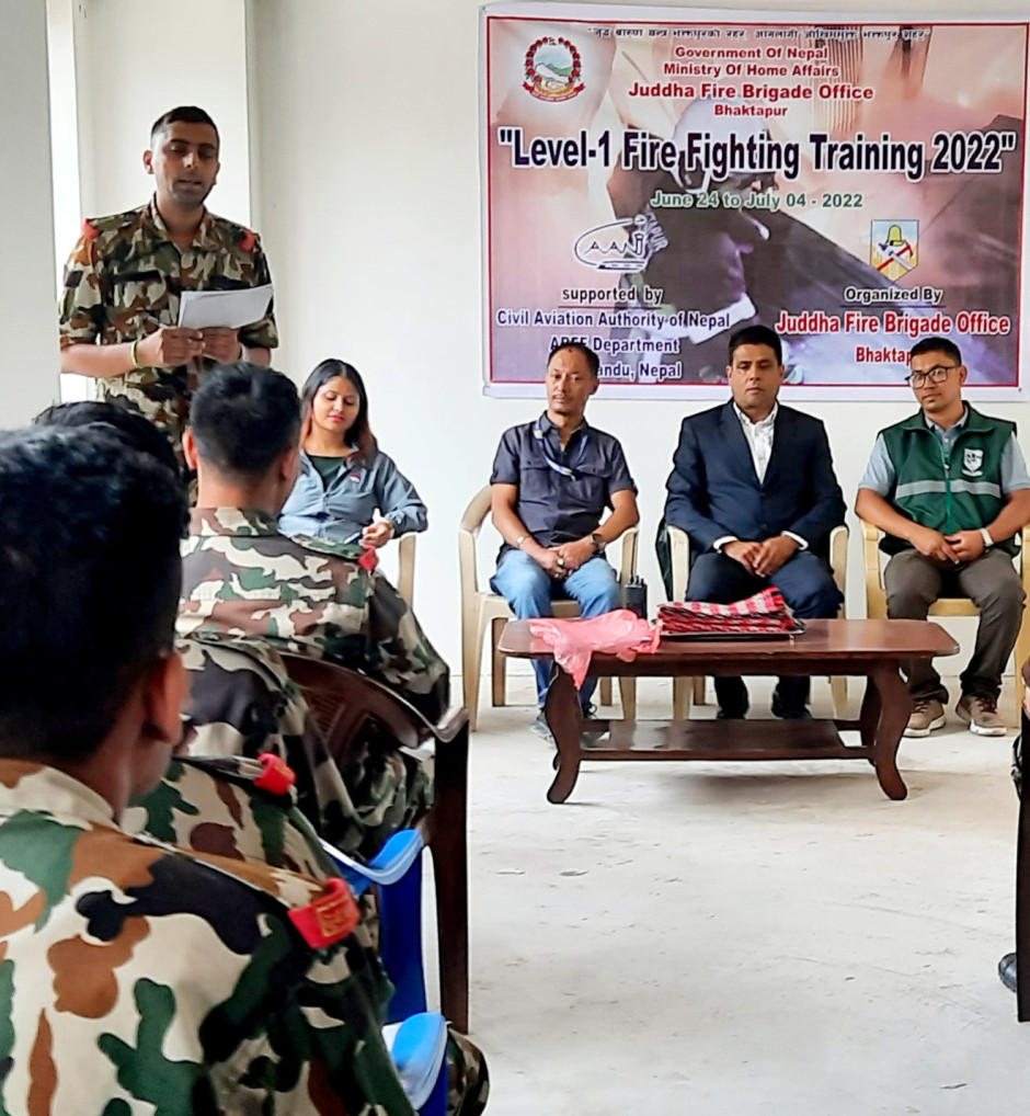 "Level 1 Fire Fighting Trainning 2022" Organize By Juddha Fire Brigade Office Bhaktapur. Supported By Civil Avation Authority of Nepal ARFF Department Kathmandu Nepal. Day 1.