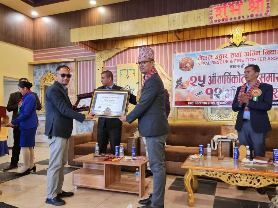 मिति २०८२/०९/०४ गतेका दिन नेपाल उद्धार तथा अग्नि निवारण संघ (Nepal Rescue and Firefighter Association- NRFFA) को २५ औं वार्षिकोत्सव एवम् १२ औं महाधिवेशन कार्यक्रममा जुद्ध बारुण यन्त्र कार्यालय भक्तपुरको कार्यालय प्रमुख श्री विजय प्रसाद धौभडेल ज्यूलाई उपत्यकाको अग्निनियन्त्र जस्तो अत्यावश्यक र संवेदनशील सेवालाई नियमित अग्निनियन्त्रण क्षमता अभिवृद्धि तालिम संचालन, अग्नि निवारण एवं सुरक्षा सामाग्रीको बन्दोबस्तलगायतका गतिविधिद्वारा समग्र वारुण यन्त्रको सेवाप्रवाहलाई चुस्तदुरुस्त बनाएर उत्कृष्ट कार्य गर्नुभएकोमा उहाँको महत्त्वपूर्ण योगदानको कदरस्वरुप सम्मान पत्र प्रदान गरिएको छ । यो प्रेरणादायी तथा थप मनोबल प्रदान गर्ने सम्मानको लागि नेपाल उद्धार तथा अग्नि निवारण संघ परिवारप्रति हार्दिक आभार व्यक्त गर्दै आगामी समयमा पनि अग्नि नियन्त्रणको क्षेत्रमा निरन्तर सहयोग र सहकार्यको अपेक्षा राख्दछौं ।