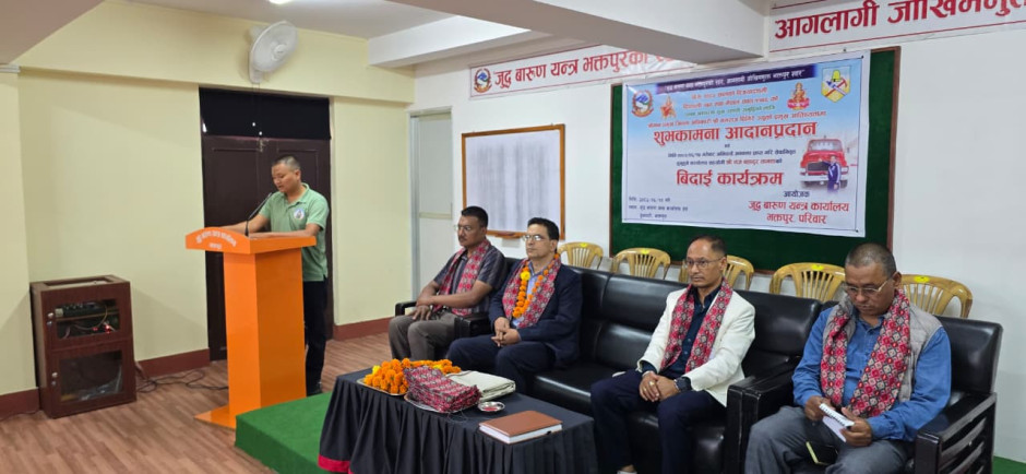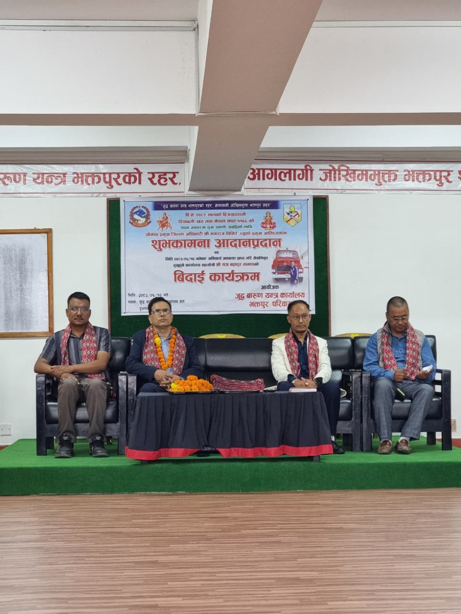 मिति २०८२/०६/१० गतेका दिन जुद्ध बारुण यन्त्र कार्यालय भक्तपुरको आयोजनामा कार्यालय प्रमुख श्री विजय प्रसाद धौभडेल ज्यूको सभाध्यक्षतामा, श्रीमान् प्रमुख जिल्ला अधिकारी श्री नमराज घिमिरे ज्यूको प्रमुख आतिथ्यतामा, अतिथि नेपाल पत्रकार महासंघ जिल्ला शाखा भक्तपुरका अध्यक्ष श्री सुन्दर शिल्पकार ज्यू, अतिथि रासस पत्रकार श्री रमेश गिरी ज्यू तथा कार्यालयका सम्पूर्ण कर्मचारीहरुको उपस्थितिमा वि.सं. २०८२ सालको विजयादशमी, दिपावली, छ्ठ तथा नेपाल संवत् ११४६ को पावन अवसरमा सुख, शान्ति र समृद्धिको लागि शुभकामना आदानप्रदान एवं मिति २०८२/०६/१५ गतेबाट अनिवार्य अवकास प्राप्त गरि सेवानिवृत्त हुनुहुने कार्यालय सहयोग श्री यज्ञ बहादुर तामाङ ज्यूको बिदाई कार्यक्रम सम्पन्न गरियो। साथै, श्रीमान् प्रमुख जिल्ला अधिकारी श्रीमान् नमराज घिमिरे ज्यूले कार्यालयको अनुगमन निरीक्षण गर्नुभै महत्त्वपूर्ण निर्देशन, सल्लाहसुझाव तथा सहयोगको आश्वासन प्रदान गर्नुभएको छ ।